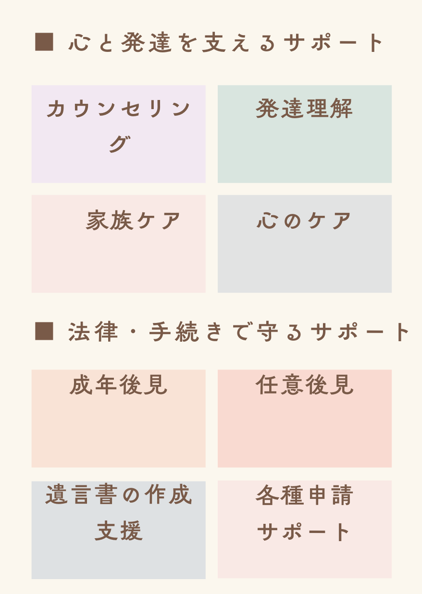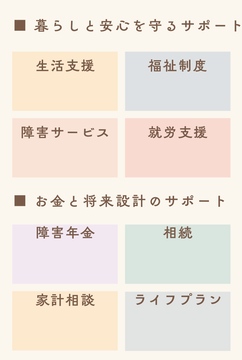 幅広い不安に、福祉・心理・制度・生活・相続・年金・働き方まで一つの窓口で“まるごと”相談できる場所 です。